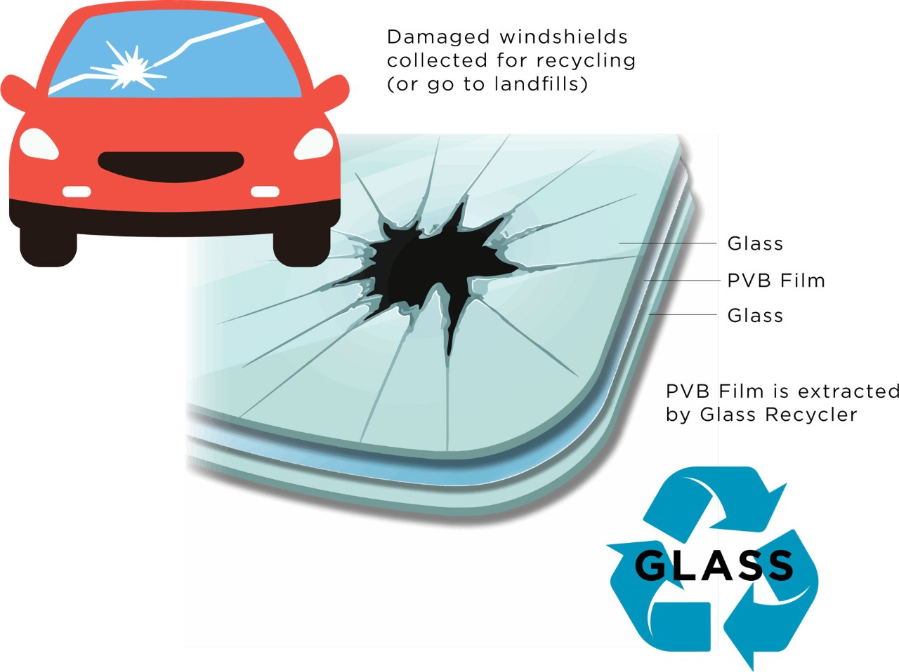 This PVB film is separated from the broken laminated glass and is recycled into chips or pellets that can be reclaimed, redirecting it from landfills.